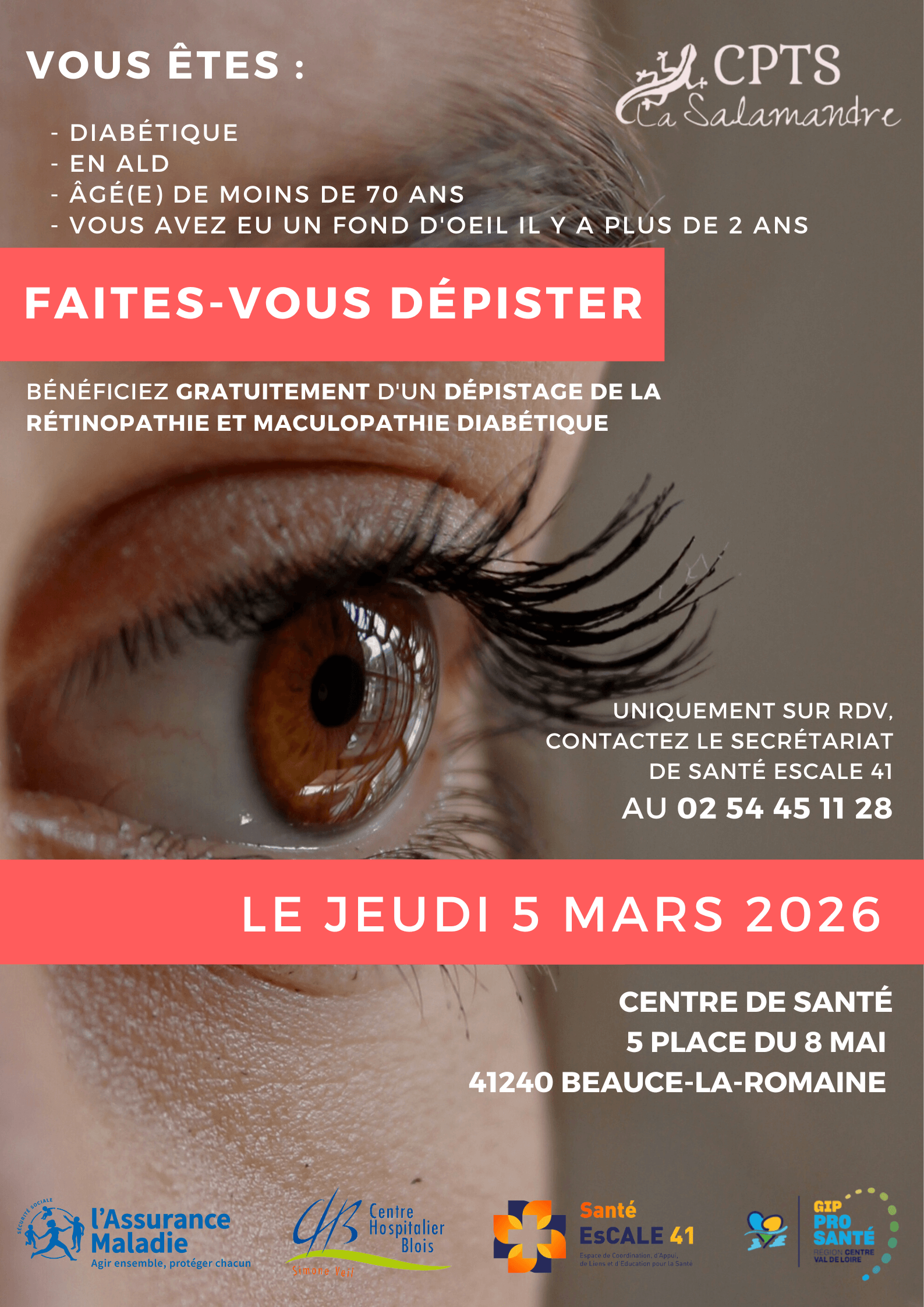 Dépistage de la rétinopathie et maculopathie diabétique Vous êtes ; diabétique, en Affection Longue Durée, âgé(e) de moins de 70 ans et vous n’avez pas eu de fond de l’œil depuis 2 ans ? La CPTS La Salamandre et Santé Escale Loir-et-Cher organisent un dépistage de la rétinopathie et maculopathie diabétique qui aura lieu le : Jeudi […]