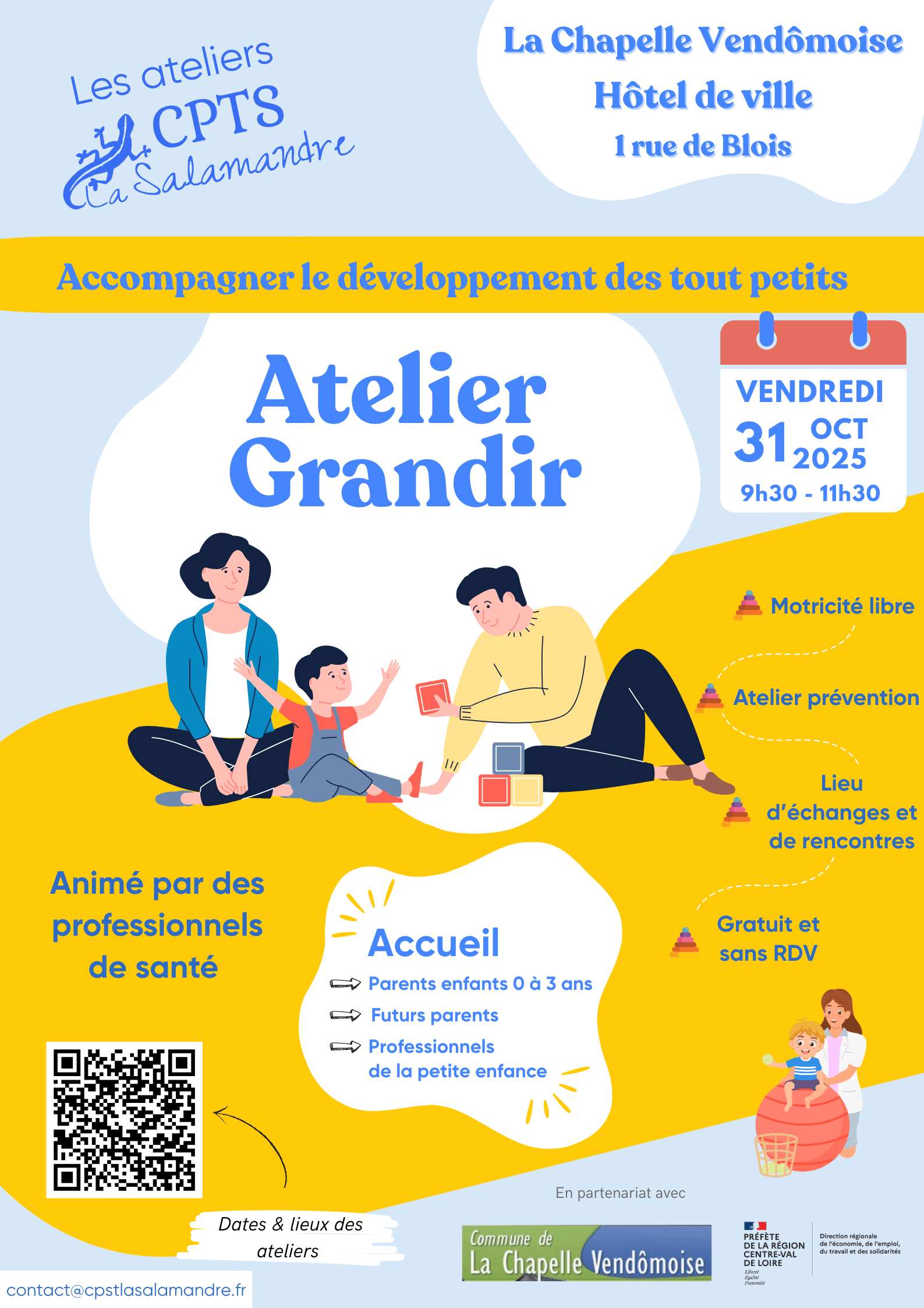 Hôtel de Ville, Salle des mariages, 1 rue de Blois, 41330 La Chapelle Vendômoise La Chapelle VendômoiseAccompagner le développement des tout petits Parents, futurs parents et professionnels de la petite enfance, venez profiter d’un moment d’échange et de rencontre avec des professionnels de santé ! La CPTS La Salamandre, en partenariat avec la commune de La Chapelle Vendômoise, organise une matinée "Atelier GRANDIR - Accompagner le développement des tout-petits" à La Chapelle Vendômoise. Une psychomotricienne sera […]